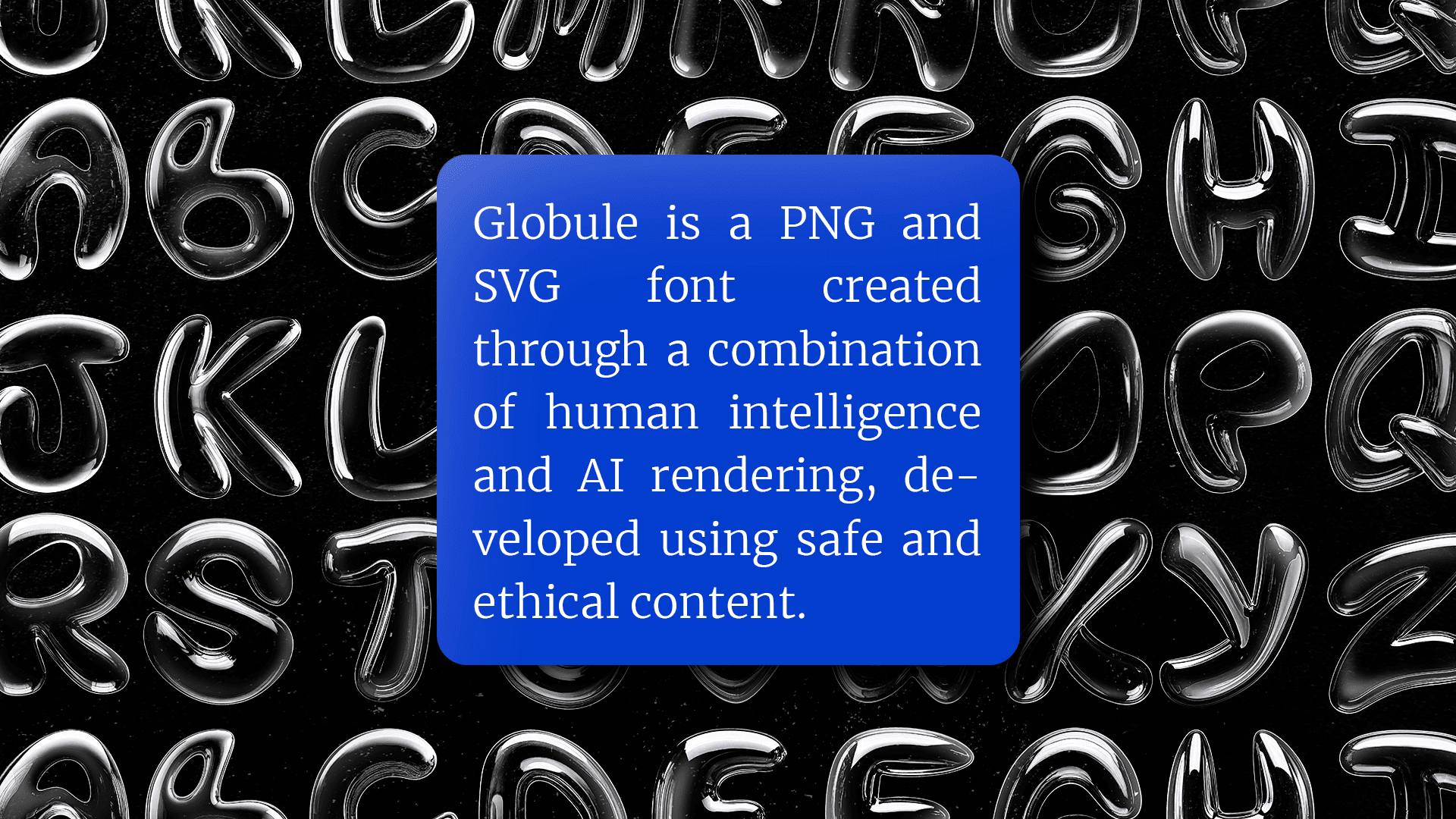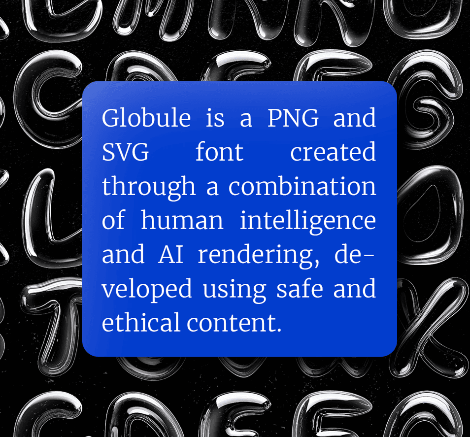 Globule is a PNG and SVG font created through a combination of human creativity and AI rendering, developed with safe and ethical content. I designed the glyphs by hand and then re-rendered each one using Adobe Firefly AI. Through a meticulous process, I modified each glyph to achieve a clean and transparent look.